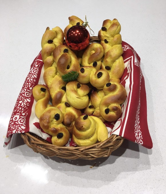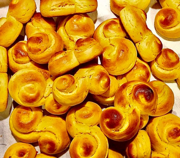 In Norway (and throughout Scandinavia) there is a somewhat similar tradition for making “Lussekatter“, or saffron buns, for the feast of Saint Lucia on December 13th. These very tasty buns have a bright yellow color (from saffron or turmeric) and are traditionally shaped into swirls and spirals. This is done to symbolize light winning over darkness and the sun slowly returning after the gloom of winter.