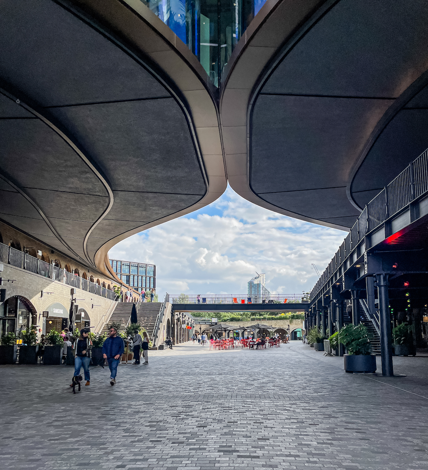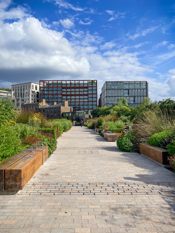 The upper level of the Coal Drops Yards continues onto Bagley Walk, an elevated parkway built on a former railway viaduct.