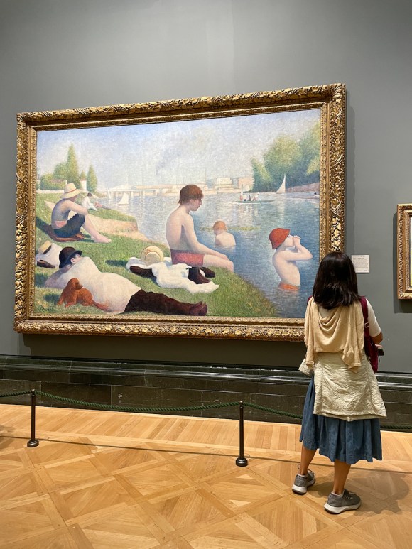 Our favorite rooms are those dedicated to the Impressionists and Post-Impressionists. Jérôme spent a long time contemplating A Wheat Field, With Cypresses; Sunflowers; and Van Gogh’s Chair by Van Gogh, The Gare Saint-Lazare and The Thames below Westminster by Monet, The Skiff by Renoir and Bathers at Asnières by Seurat. Admission to the museum is free (except for certain temporary exhibitions).