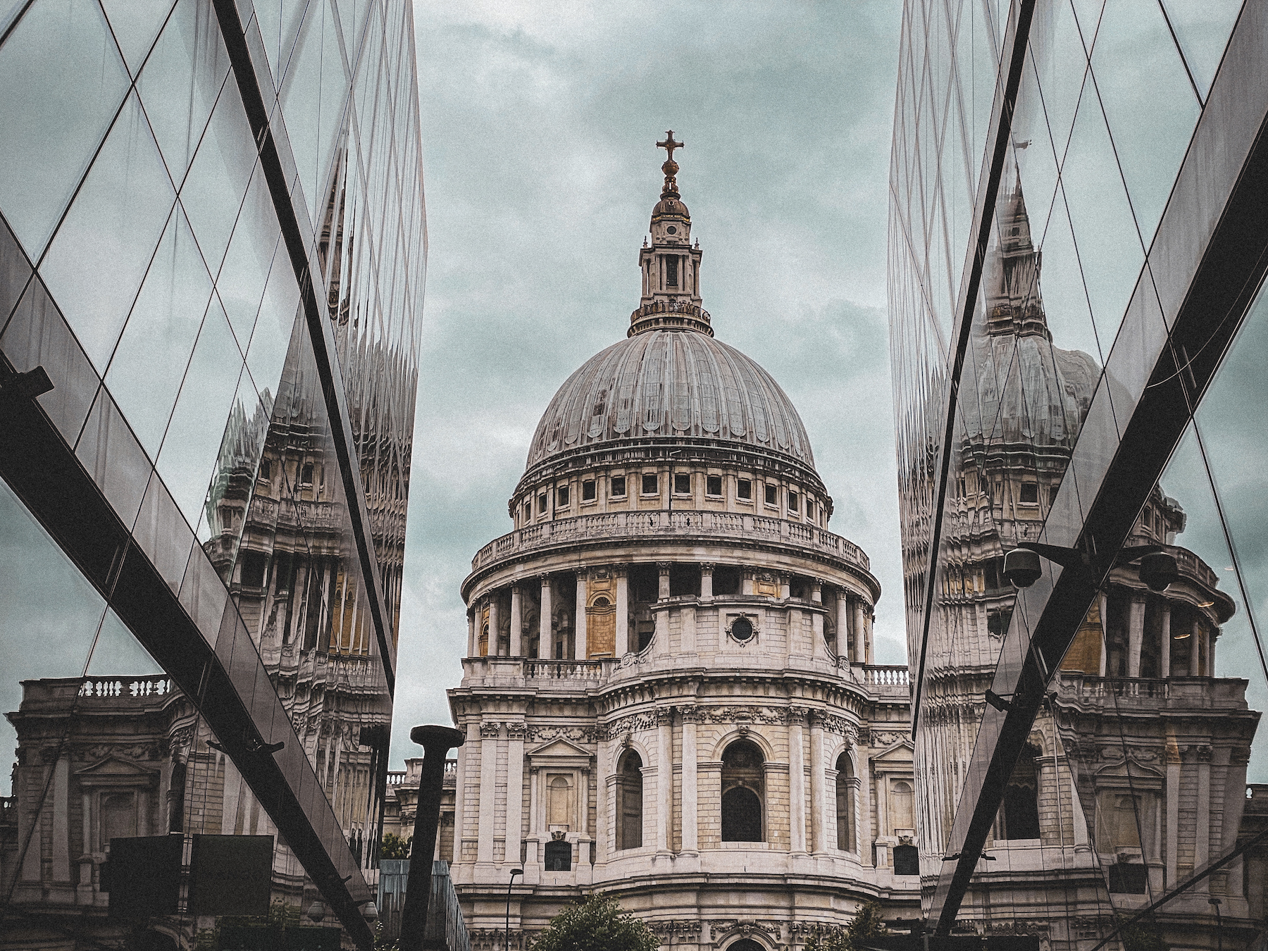 The exterior architecture of the One New Change mall offers a stunning and unusual view of St. Paul’s Cathedral. (The rooftop of the shopping center is closed until 2025.)