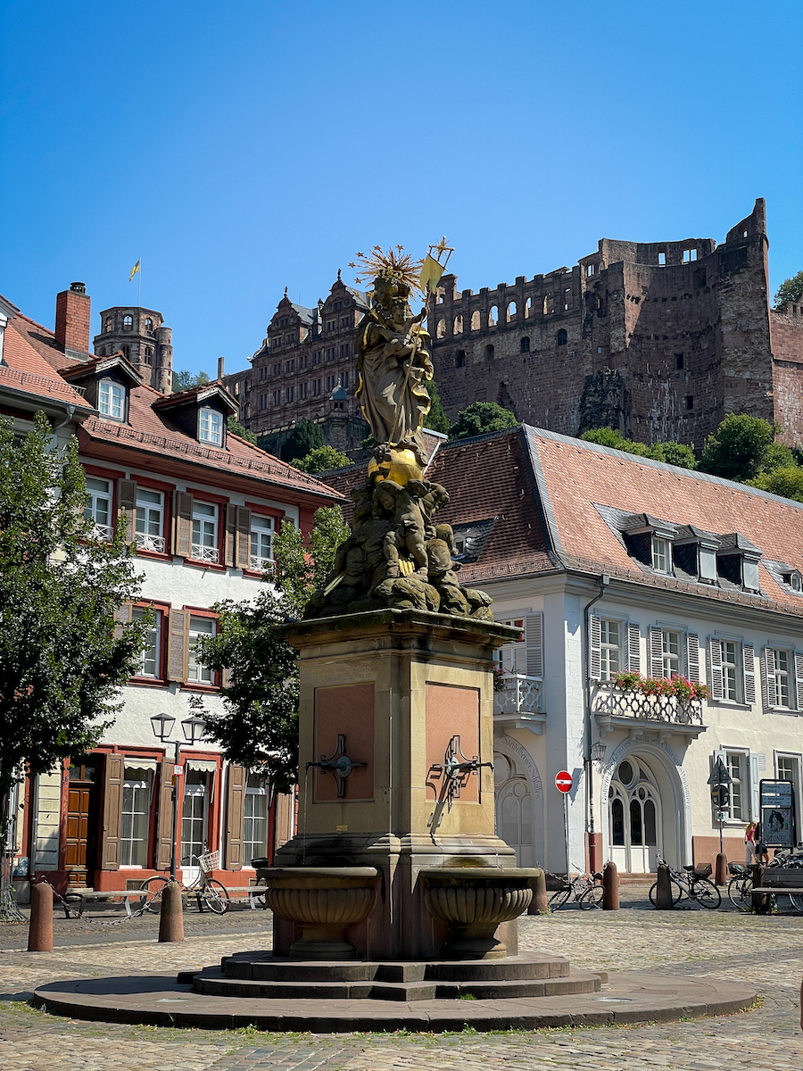 The descending funicular stops smack dab in middle of the Old Town, just a stone’s throw from the Kornmarkt (Grain Market). From this picturesque square, one of the most beautiful in Heidelberg, there is an impressive view of the Castle towering over the rooftops.