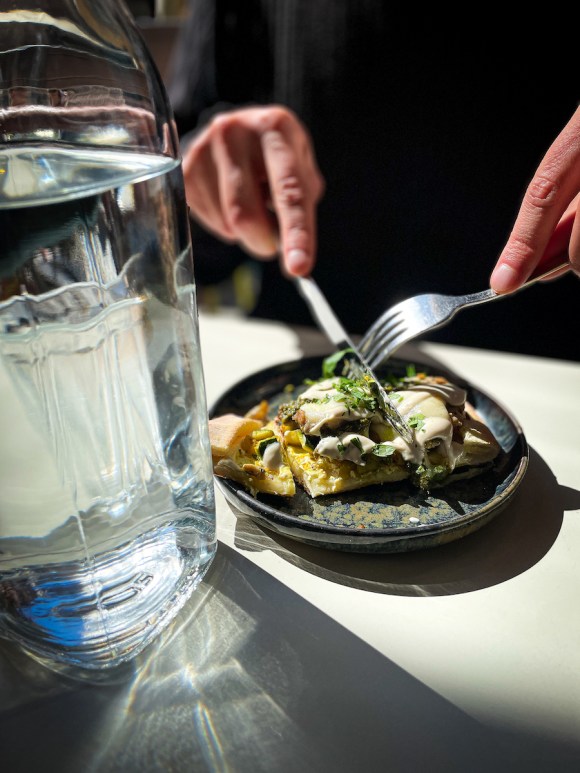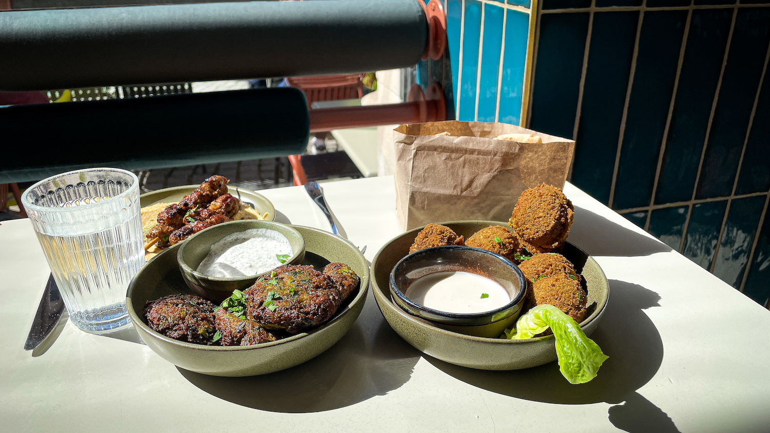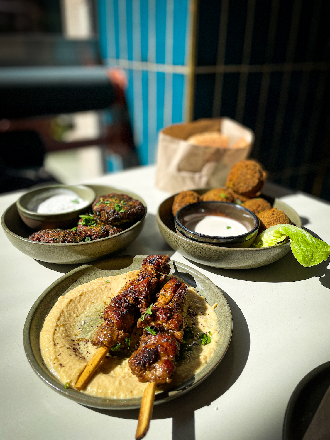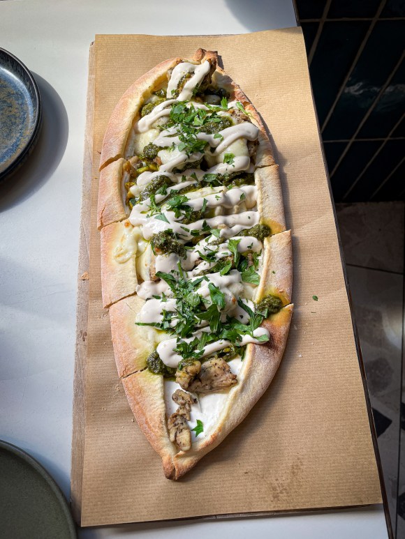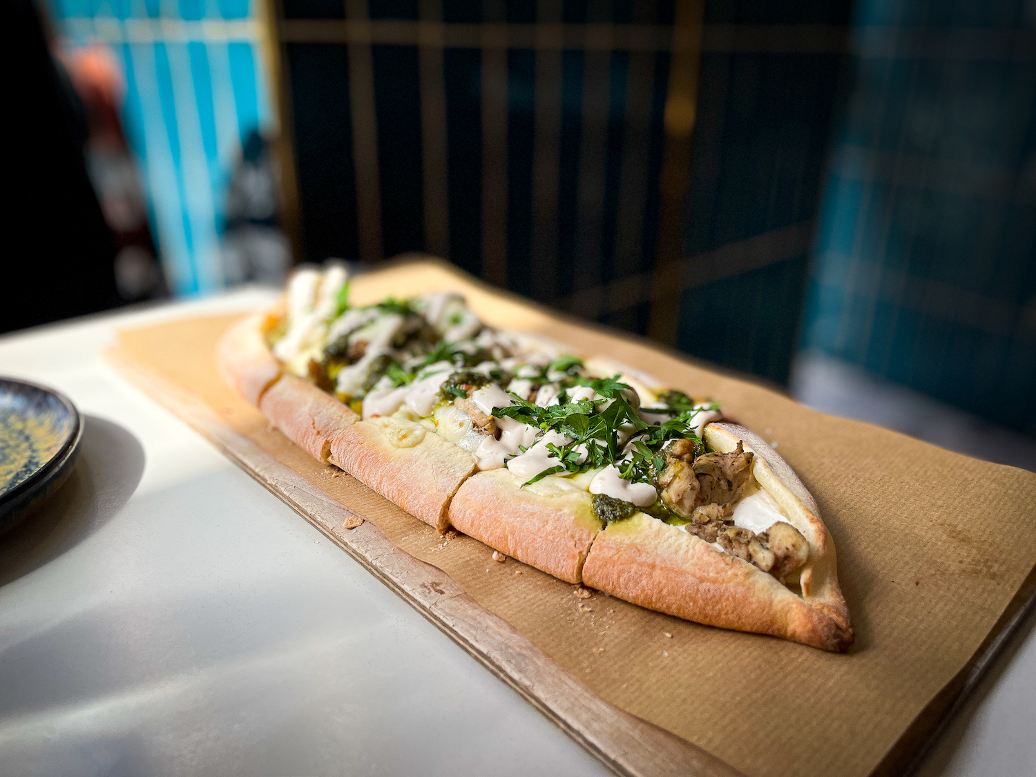 A special mention for the classic hummus with sesame (we went as far as mopping it all up with our pita bread), the zucchini patties with a mint yoghurt dip, and the chicken pide. This oval pizza-like pie, baked in the oven and topped with Greek yoghurt, sliced chicken, spiced zucchini, kaşar cheese, za’atar pesto and tarator immediately became a firm favorite for Stéphanie.